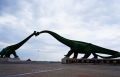在茫茫的内蒙古戈壁,草原的深处,有一座海市蜃楼,它处于内蒙的西北部,与蒙古国的扎门乌德隔界相望,这就是传说中走十几分钟就出国的城市。这时欧亚大陆桥的一颗明珠。如今,二连已经进入了一个崭新的时代,在悠悠岁月中,二连也有了大规模的发展。这里的恐龙化石出土的遗址了。在不知多少年前的白垩纪,一群又一群的恐龙来到这里,但是出于什么原因,又同时在这里消亡!自从在这里发现恐龙化石之后,一批有一批的专家先后先来探索这个未解之谜。这里来到这里,看着地上的恐龙化石,感受到了生命的悲歌。二连浩特市已经在逐步发展旅游业,因为这里是非常有名的恐龙之乡,所以现在打造的就是恐龙的品牌。沿高速公路将进二连浩特市时,远远可以看到两只恐龙的标志。这两只恐龙是世界上最大的钢结构的恐龙,也是二连的标志性建筑物。这是两只弯着头长着嘴亲吻的一对雌雄恐龙,线条是光滑的,象征着和谐美好等等。据说这两只恐龙是以目前发现的第二大的恐龙的原型制造的。高有19米,两条恐龙加起来的长度是80米非常巨大。